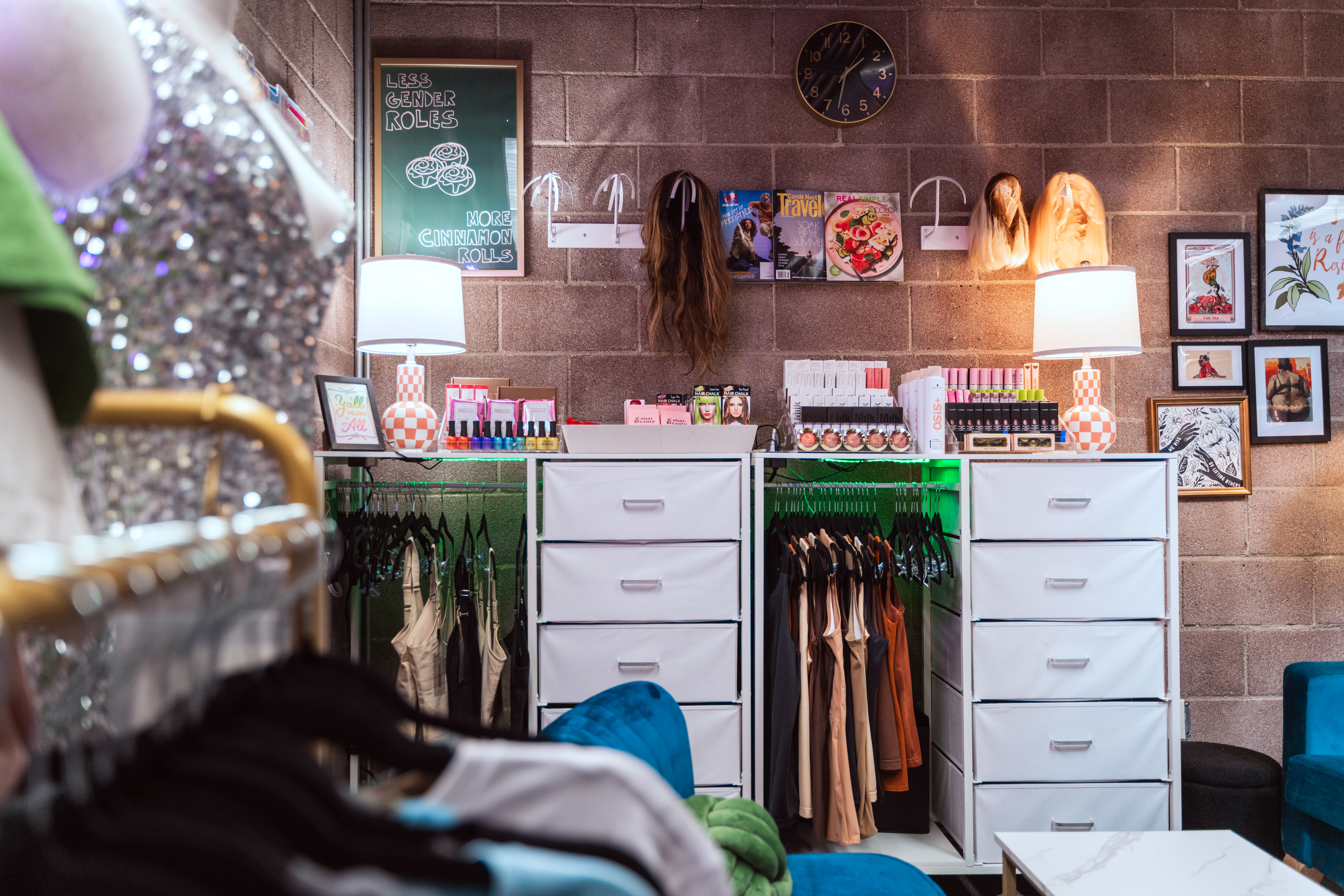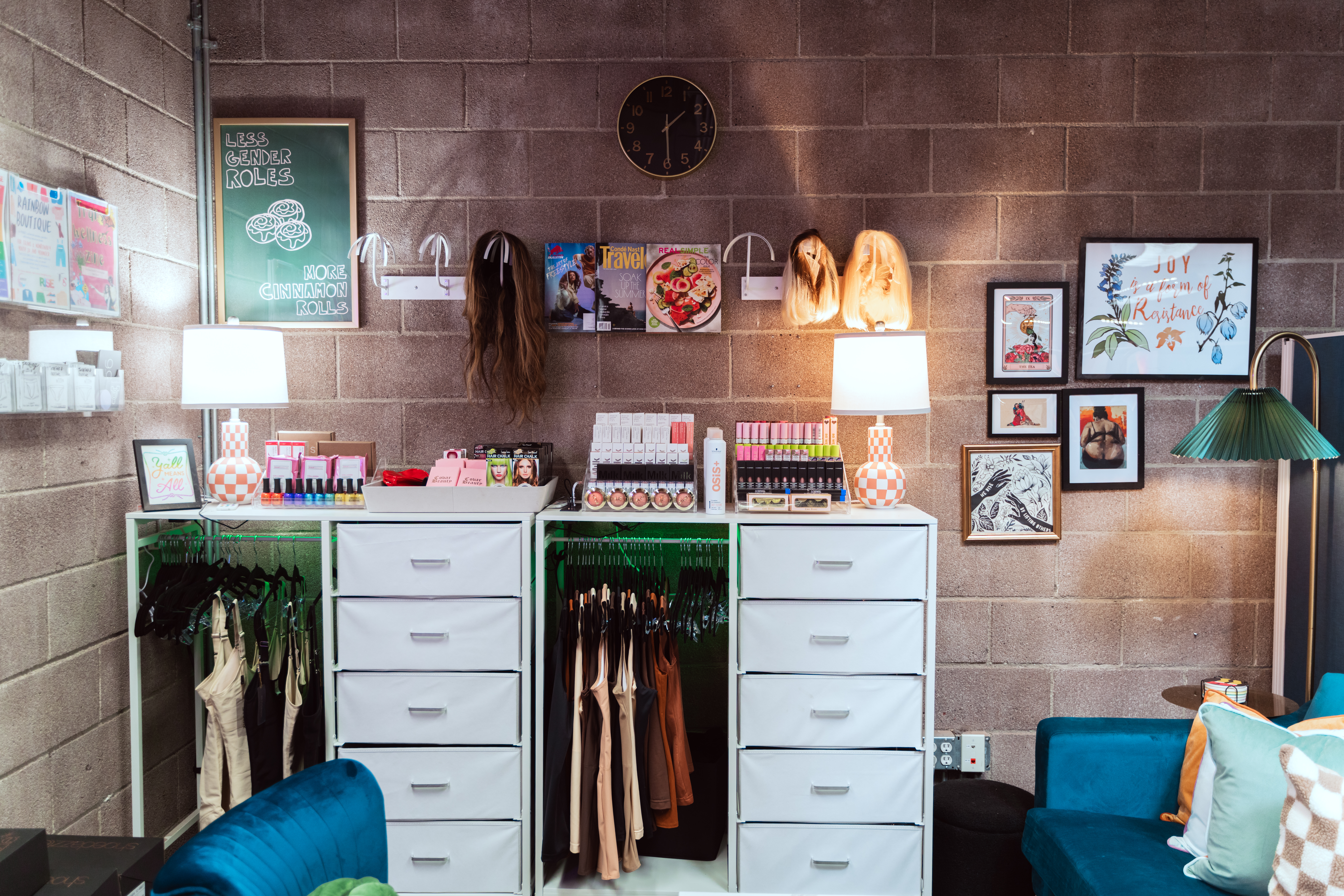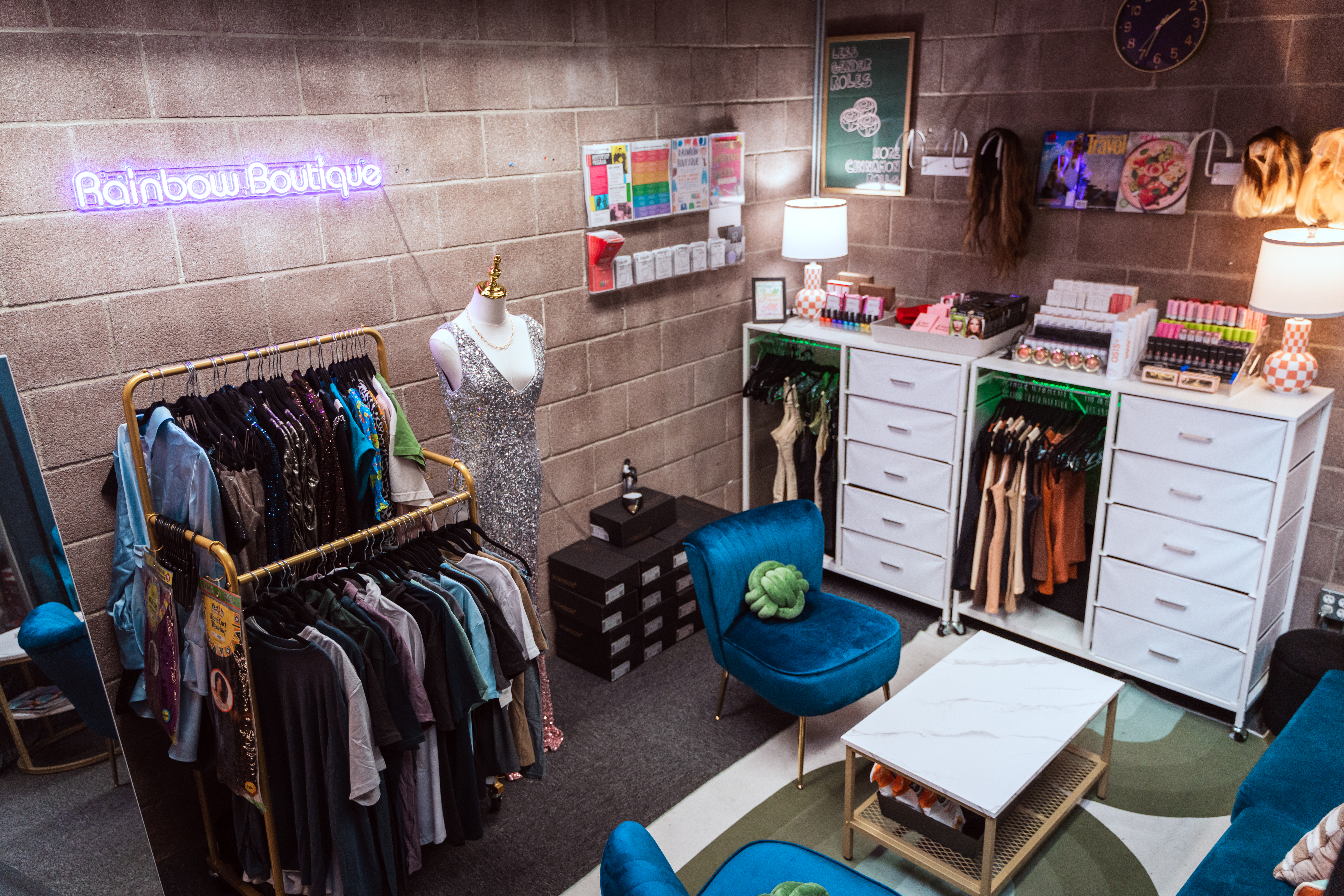 We are always in need of new items for the Rainbow Boutique, including: shoes and clothes in extended sizes, makeup, hygiene products (deodorant, body wash, skin care, etc.), wigs, accessories, shapewear, binder, gaffs, and all the other items youth may request to affirm their expression. Please use the contact form to get in touch about donating products or become a Boutique brand partner.