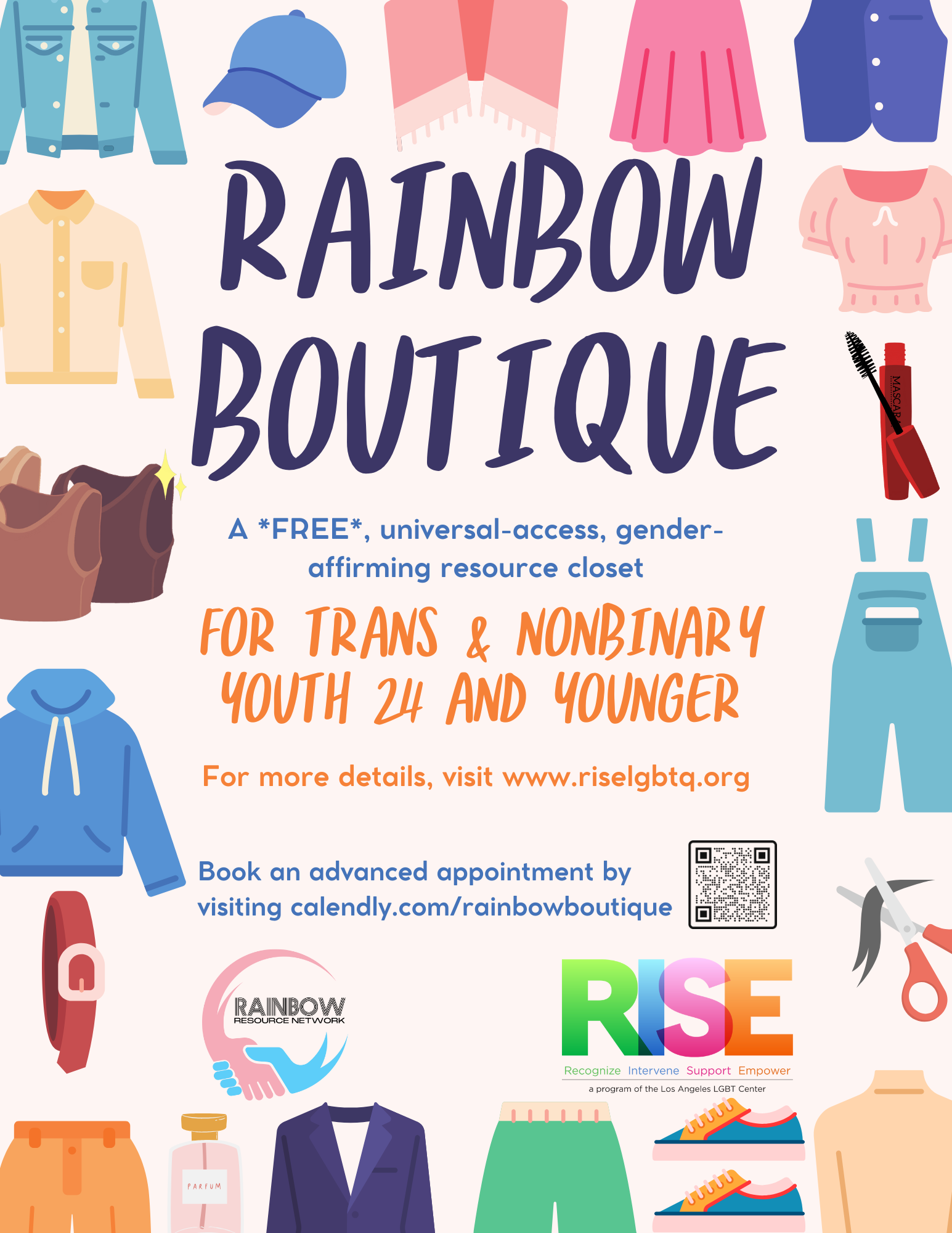 In partnership with the Pritzker Foster Care Initiative, Casey Family Programs, and Unicorn Solutions, RISE hosts one of four LA County Rainbow Resource Network closets. The Network is a free, universal-access, gender affirming closet program for LA County Youth, 24-years-old and younger in search of clothing, services, etc. which affirm their gender identity and/or gender expression.
